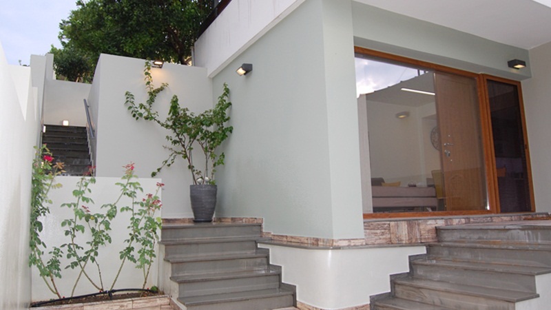 Στο τρίτο επίπεδο υπάρχει διαμορφωμένος χώρος barbeque και βοηθητικό wc. Τα τρία επίπεδα διαθέτουν γρανιτένια αντιολισθητικά πλακίδια εξωτερικού χώρου και διαμορφωμένες σκάλες επενδεδυμένες με γρανίτη. Οι εξωτερικοί χώροι είναι διαμορφωμένοι με παρτέρια με καλλωπιστικά φυτά και οπωροφόρα δένδρα, των οποίων το πότισμα γίνεται με αυτόματο σύστημα. Η κατοικία διατίθεται πλήρως εξοπλισμένη με καινούργιες ηλεκτρικές οικιακές συσκευές, τηλεοράσεις στους κυρίως χώρους και στα υπνοδωμάτια καθώς και πλήρως επιπλωμένη. Διαθέτει επίσης ανοιχτή θέση σταύθμευσης στο χώρο της αυλής και ανεξάρτητο χώρο λεβητοστασίου. Το ακίνητο το οποίο είναι κατάλληλο τόσο για μόνιμη κατοικία όσο και για εξοχική, απέχει από το κέντρο και την παραλία 300μ.